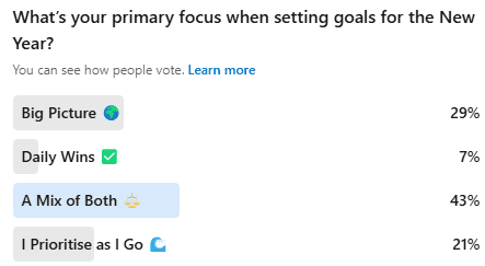 It’s always insightful to see how different people tackle goal setting. No matter your approach, the key is finding what works best for you! Thank you to everyone who took part, your engagement makes these discussions even more valuable.